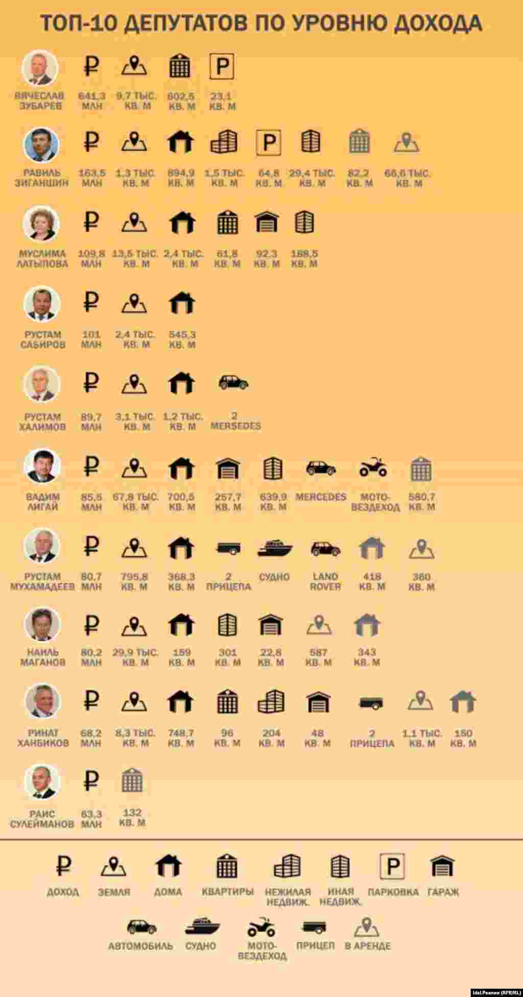Самый богатый депутат Госсовета в 2016 году заработал 641,3 млн рублей. Им стал Вячеслав Зубарев, председатель совета директоров "ТрансТехСервиса". За ним расположился "главный строитель Татарстана" глава ПСО "Казань" Равиль Зиганшин с 163,5 млн рублей дохода и владелица сети супермаркетов "Бахетле" Муслима Латыпова с 109,8 млн рублей. Сколько заработал топ-10 депутатов Госсовета в прошлом году и чем они владеют — в инфографике "Idel.Реалии".