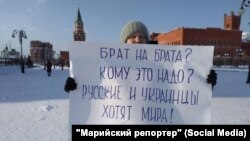 В Йошкар-Оле прошел одиночный пикет против российско-украинской войны, сообщает "Марийский репортер". Участница пикета, имя которой не называется, держала в рукат плакат с надписью "Брат на брата? Кому это надо? Русские и украинцы хотят мира".